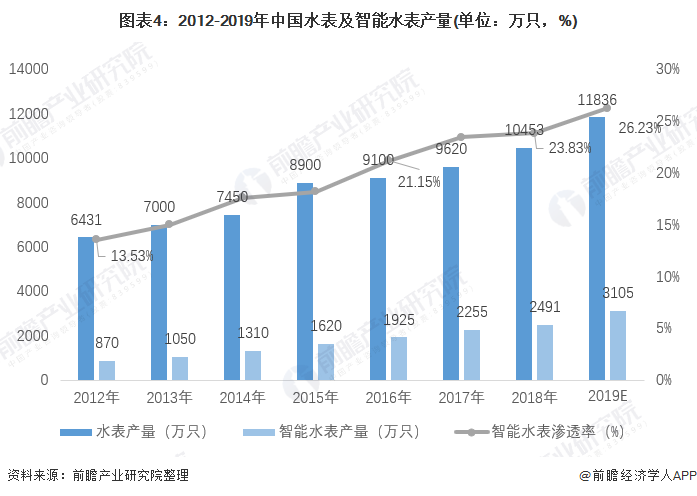 在國家政策和技術(shù)的促進(jìn)下,及依托智能水表在智慧水務(wù)發(fā)展背景下的獨(dú)特的優(yōu)勢,我國智能水表的滲透率和產(chǎn)量不斷增加。2012年我國水表產(chǎn)量為6431萬只,智能水表產(chǎn)量僅為870萬只,智能水表的滲透率僅為13.53%,不足15%。據(jù)統(tǒng)計,至2018年我國智能水表產(chǎn)量超過2400萬只,市場滲透率達(dá)到23.83%,預(yù)計2019年我國智能水表產(chǎn)量超過3000萬只,市場滲透率進(jìn)一步提升,將超過26%。