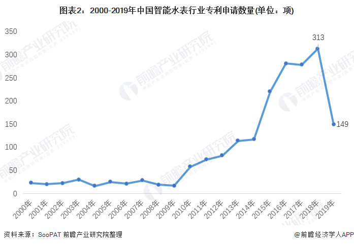 在國家政策的促進(jìn)下,智慧水務(wù)的發(fā)展對智慧水表的需求也不斷提升,促進(jìn)了企業(yè)對相關(guān)技術(shù)的重視, SooPAT公布數(shù)據(jù)顯示,2000-2018年我國智能水表的專利申請數(shù)波動增加,2018年共申請專利313項,2019年智能水表技術(shù)發(fā)展進(jìn)入穩(wěn)定沉淀期,天津水處理設(shè)備專利申請數(shù)有所下降,為149項。
